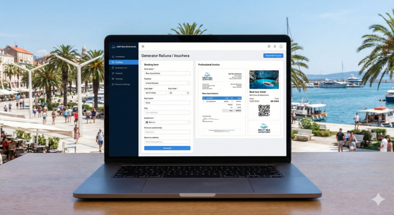 Izdvojeni opis (Featured Desc): Predstavljamo vrhunsko administrativno rješenje dizajnirano specifično za organizatore brodskih izleta i turističke agencije u Splitu. Naš "Generator Računa i Vouchera" eliminira stres ručne papirologije, omogućujući vam da se fokusirate na pružanje nezaboravnog iskustva gostima. Ova intuitivna web aplikacija drastično ubrzava proces check-ina i prodaje. U samo nekoliko sekundi unesite podatke o gostu, odaberite izlet (poput popularne ture Plava špilja i Hvar), a sustav će automatski izračunati cijene za odrasle i djecu te primijeniti eventualne popuste. Rezultat su trenutno generirani, profesionalno dizajnirani računi i voucheri (karte) visoke rezolucije (JPG), spremni za digitalno slanje ili ispis na licu mjesta. Uz punu dvojezičnu podršku (hrvatski i engleski), Dark Mode za noćni rad i napredni "Export Suite" za upravljanje podacima, ovo je alat koji modernizira vaše poslovanje na splitskoj Rivi.