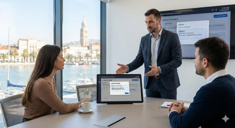 AI Objection Shield: Modul za vježbanje i real-time pomoć kod najčešćih prigovora (cijena, termin, konkurencija).