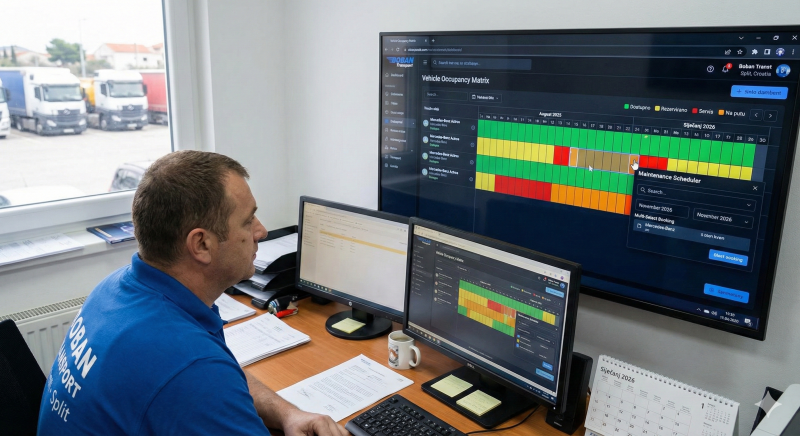 Vehicle Occupancy Matrix je visokofunkcionalna kontrolna ploča dizajnirana za dinamično okruženje tvrtke Boban Transport. Ovaj alat rješava kompleksan izazov usklađivanja dostupnosti vozača, zahtjeva klijenata i nužnih servisnih intervala. Kroz intuitivnu matricu, dispečeri mogu u realnom vremenu vidjeti status svakog vozila. Ključna značajka je multi-select booking, koja omogućuje rezervaciju više vozila ili više dana jednim povlačenjem miša. Sustav simulira iCal uvoz, dopuštajući sinkronizaciju s vanjskim kalendarima partnera, te nudi potpunu fleksibilnost s Dark/Light mode opcijom za rad u svim uvjetima (danju u uredu ili noću u dispečerskom centru). Sve podatke je moguće izvesti u jedan klik, čime se drastično skraćuje vrijeme potrebno za izvještavanje i obračun.