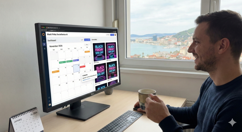 Black Friday SocialGenius AI je vaš tajni adut za osvajanje tržišta u studenom 2026. Umjesto da provodite tjedne planirajući vizuale i tekstove, naša platforma koristi Gemini 1.5 Pro i Nano Banana modele kako bi iz vašeg jednostavnog popisa proizvoda i postotaka popusta stvorila: psihološki optimizirane prodajne tekstove, strategiju objavljivanja (teasing, launch, last call) te hiper-realistične AI slike koje vrište "luksuzni popust". Naš AI razumije estetiku Crnog petka – od neonskih natpisa do sofisticiranih crno-zlatnih paleta – i kreira vizuale koji zaustavljaju palac pri skrolanju.