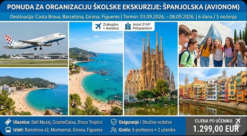 Ova premium školska ekskurzija u Španjolsku (rujan 2026.) dizajnirana je kako bi pružila savršen balans edukacije, kulture i nezaboravne zabave za srednjoškolce, uz maksimalnu sigurnost i udobnost putovanja avionom. Zaboravite na iscrpljujuće višesatne vožnje autobusom; letimo direktno Croatia Airlinesom iz Zagreba, što znači više vremena za uživanje na destinaciji. Smješteni u srcu Costa Brave, Lloret de Maru, učenici će imati priliku istražiti katalonsku prijestolnicu Barcelonu kroz dva temeljita posjeta – od Gaudijeve Sagrade Familije do interaktivnog znanstvenog muzeja CosmoCaixa. Program uključuje "Dalijev trokut" u Figueresu, mistični Montserrat i povijesnu Gironu. Poseban naglasak stavljen je na "all-inclusive" doživljaj: sve ključne ulaznice su uključene u cijenu, kao i ekskluzivna ulaznica za Disco Club Tropics za sve dane boravka. Uz puni paket osiguranja i stručno vodstvo, ovo je putovanje koje stvara uspomene za cijeli život bez organizacijskih briga.
